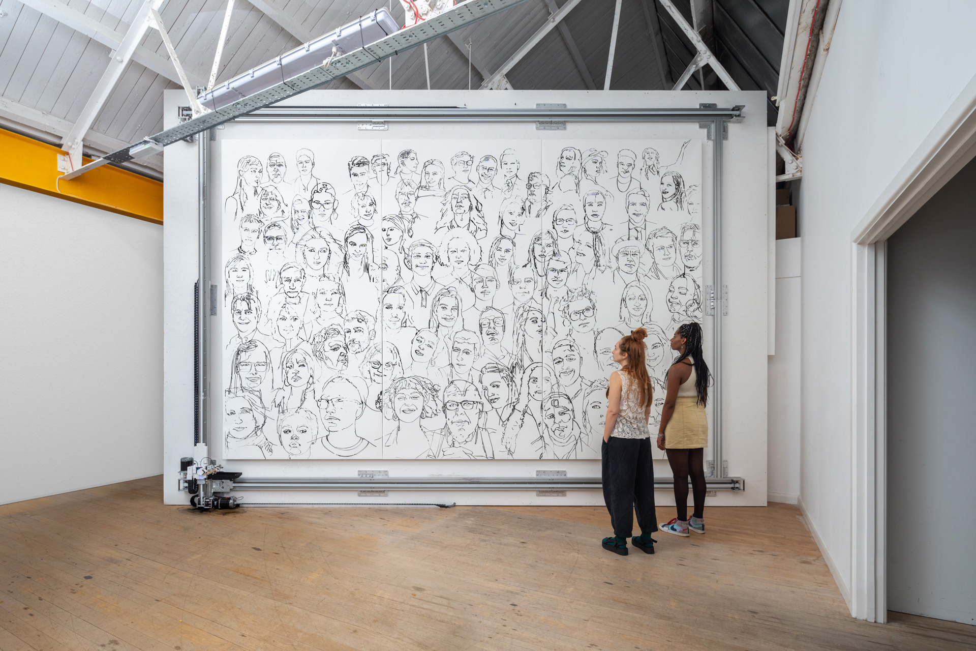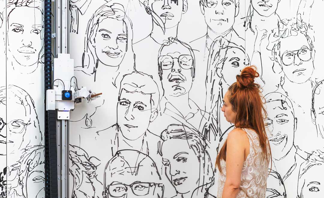 ‘Faces Of…’ explores how AI can facilitate new kinds of interactions between artwork and audience. The installation begins as a blank canvas. Every audience member who enters the space sees their portrait start to be added to this canvas, painted in a performance by a robotic mechanism holding an ink brush. One by one, the audience becomes the artwork; the final canvas is a snapshot of the community who passed through that space on that day.